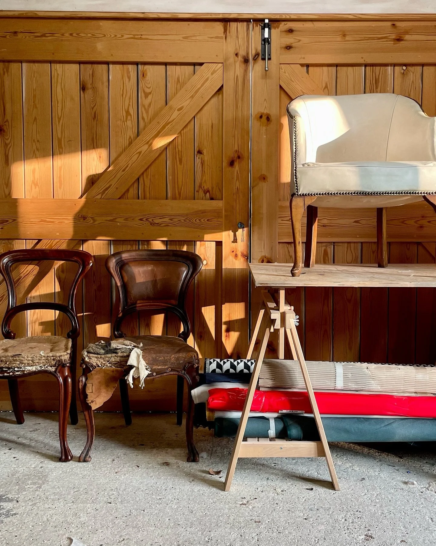 Items for sale including restored and upholstered vintage and antique chairs, handmade ottomans and folding screens.